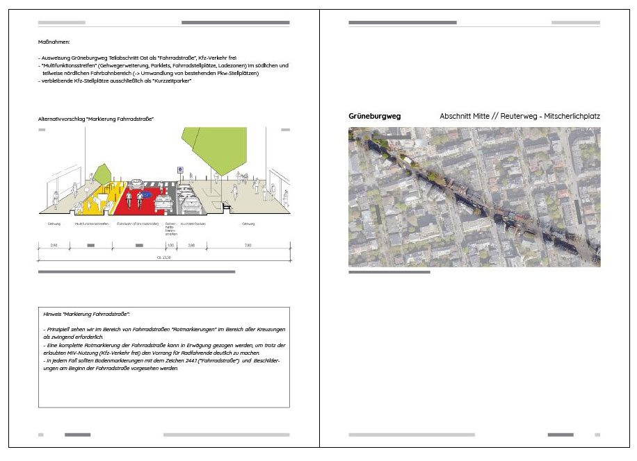 // Die Fahrradstraßen werden, wann immer es die (Kfz-)Belastung der querenden Straße erlaubt, als Vorfahrtstraße geführt.