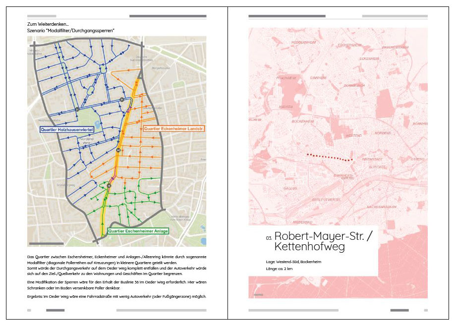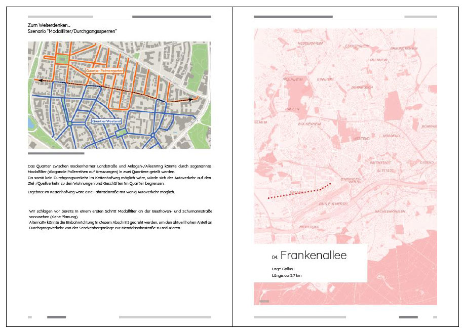 Da für „Fahrradfreundliche Nebenstraßen“ bisher keine genaue Definition und keine festgelegten Gestaltungsstandards bestehen, haben wir Gestaltungsvorschläge und ein übergeordnetes Konzept aus verschiedenen Maßnahmen entwickelt: Die „Frankfurter Fahrradstraße“.